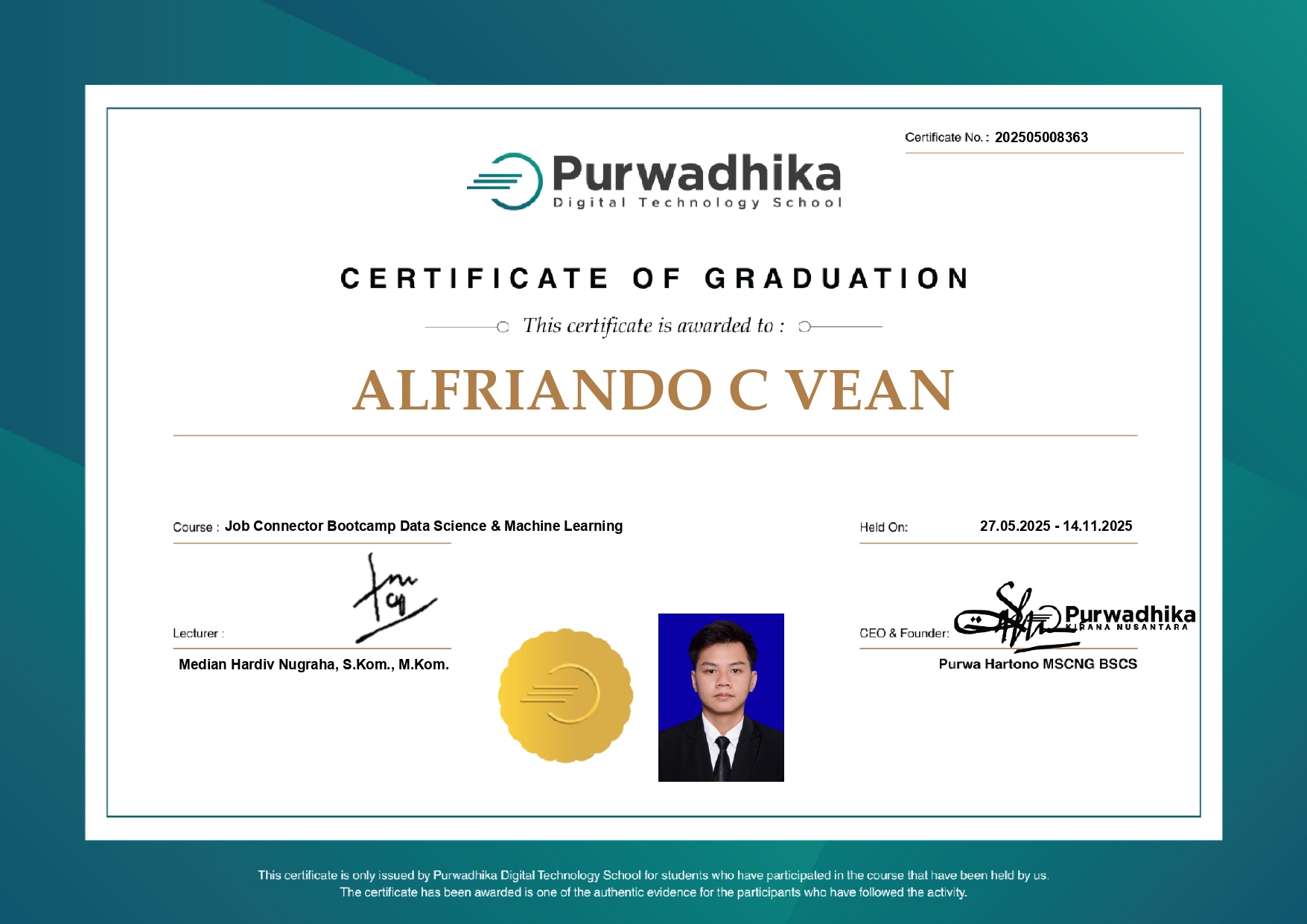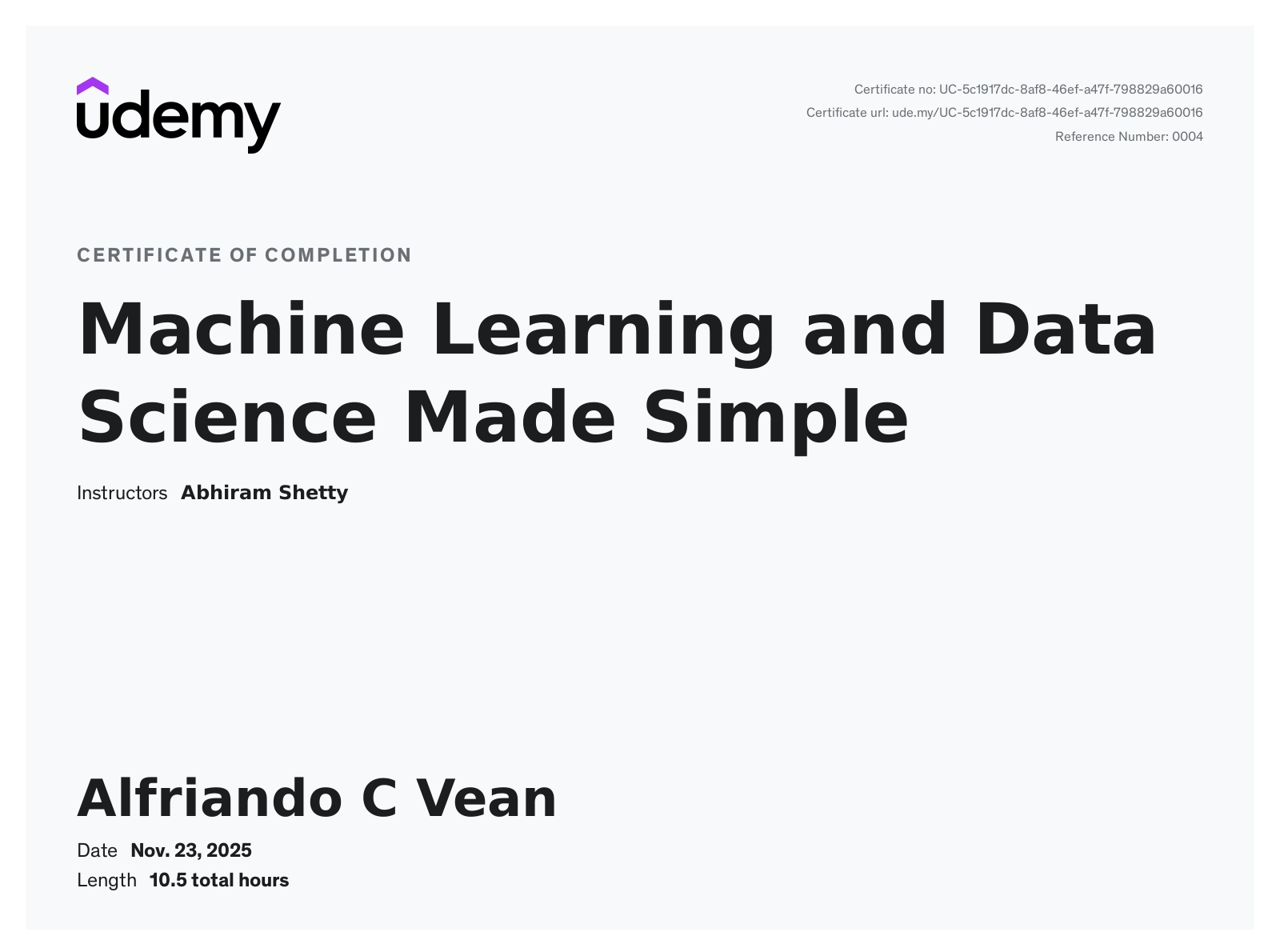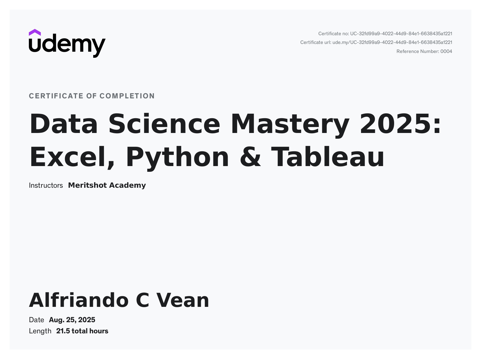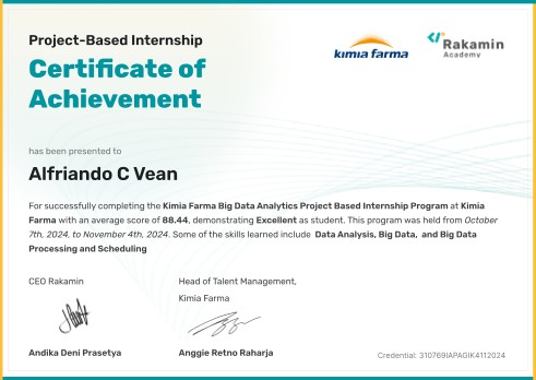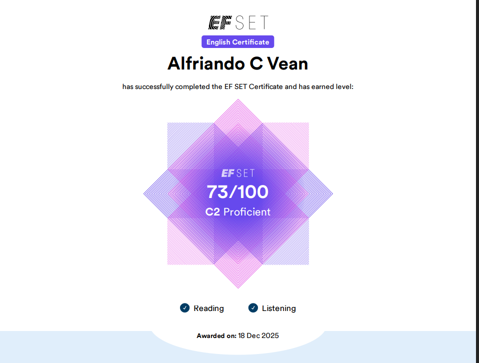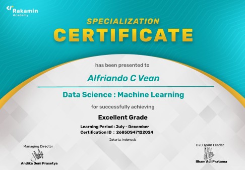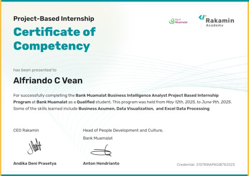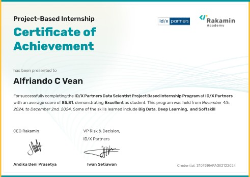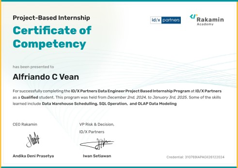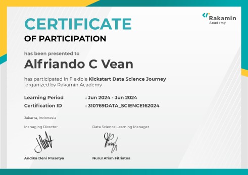 My name is Alfriando C Vean, commonly called Alfri. I'm a detail-oriented Data Analyst with practical experience in building machine learning models, optimizing data pipelines, and developing analytical solutions. Skilled in Python (Pandas, Matplotlib, Seaborn, Scikit-learn, etc.), SQL, statistics, and data visualization tools.